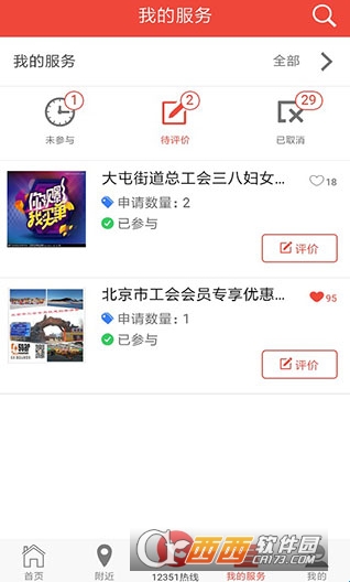3、而在【活动入口】页面,我们还可以根据当前活动或者具体区域来查找自己感兴趣的活动;【我的服务】页面则是会显示用户参与的历史活动,你还可以在此对这些活动做出评价。