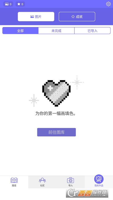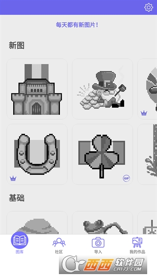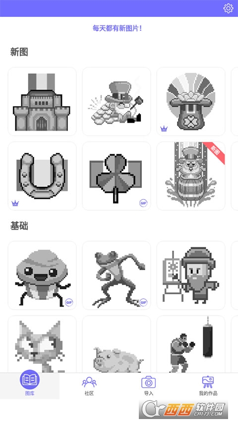 1、首先在本站下载并安装 后打开游戏,进入游戏时默认为图库界面,在此界面各位小伙伴可以看到很多不同类型的新图以及基础图,玩家只需点击任意一张想要绘制的图片即可