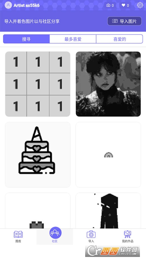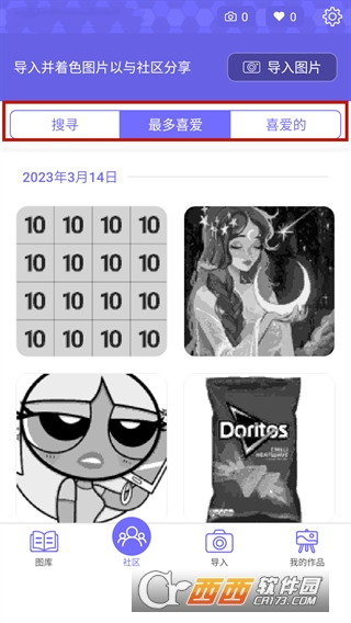 2、在社区板块玩家不仅可以与搜寻自己喜欢的图片类型,同时还支持导入本地图片进行着色,更有一键分享功能,你可以在第一时间将自己完成的作品分享给自己的好友