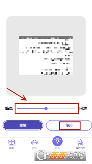 4、选定图片后应用将自动为各位小伙伴生成填色模板,你可以选择拉动图示位置来调节填色的难度,当设置完成后点击使用即可进入填色