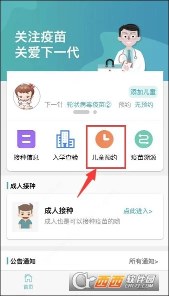 6、绑定儿童之后,点击儿童预约,进入预约页面,点击接种预约,可以看到预约通知,点击继续预约,选择日期、时间段,点击确定,即预约成功;