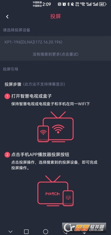 3.请确保我们的手机和电视连接同一个WiFi,然后点击屏幕下方的设备列表中出现的相匹配的设备名称,就可以开始投屏了。