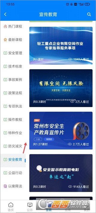 1、打开常州应急官方APP进入首页,切换到“宣教”这个模块,选择左边的安全教育区域,右边有很多的安全教育课程,点击自己喜欢的课程并点进去。