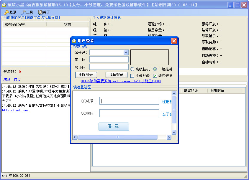 友情提示: QQ吉祥旅馆辅助是一款纯免费辅助工具。 辅助工具定义:以辅助玩家游戏为目的,实现更加便捷方便的玩游戏,主要因为现在游戏操作过于复杂,过于单调,使用玩家们都想需要这么款辅助软件来帮助游戏.该工具不具有恶意修改或篡改游戏数据,损坏游戏功能.只有这类辅助工具是合法。 本软件属于辅助工具,严格遵循中华人民共和国《计算机软件保护条例》.
