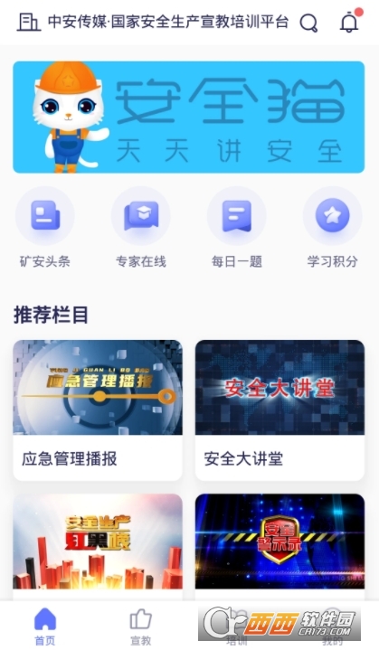 安全猫(生产安全学习)安卓版是一款国家安全生产宣教培训平台,使用方法简单,在这里汇集了多种安全知识内容,拥有相关的矿安资讯,还有专家为你在线解决问题,拥有多种学习栏目,可以自由选择学习,可以开启消息通知服务,西西下载即可安装使用哦!