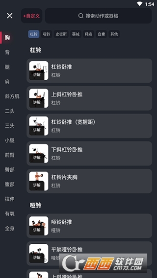 【丰富动作库】 300+训练动作,覆盖各种器械,持续更新,支持自定义动作。