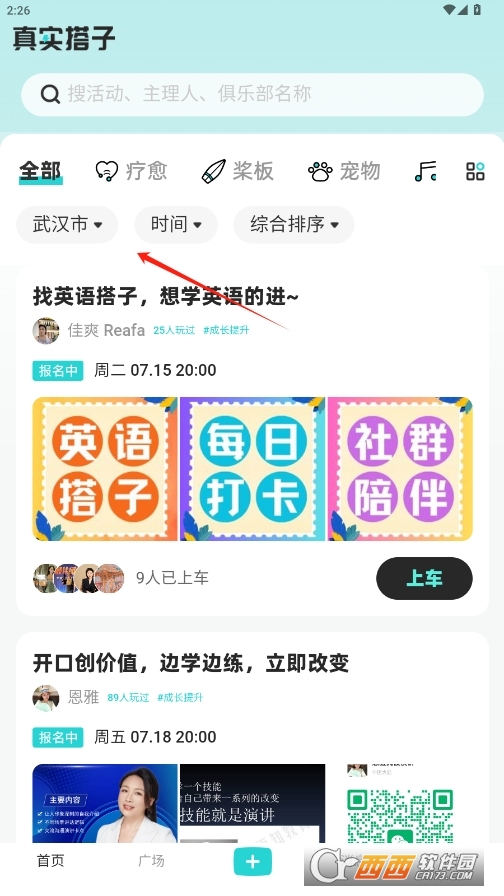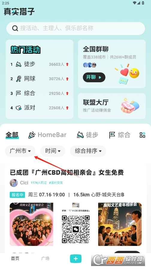 想要切换了解另外一个城市的活动的话,可以在主页中间位置找到你定位所在的城市名,点击一下