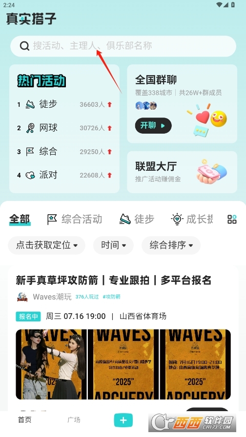 进入主页我们点击上方搜索框输入活动关键词来寻找搭子