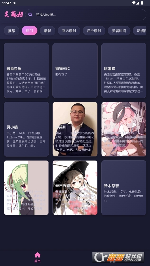 “灵萌AI”核心是“自定义角色+趣味互动”,主打“你的角色,随心畅聊”。它解决了同类AI聊天软件角色固定的问题,让用户从被动接受转为主动创造,无论是想拥有贴心的倾听者,还是搞怪的互怼伙伴,都能通过自定义实现,比如创建“职场前辈”角色,模拟工作中的交流场景。除基础聊天,支持“角色记忆”(记住聊天中的关键信息,如“喜欢吃草莓”,后续对话会提及)、“互动小游戏”(和AI玩猜谜、成语接龙,增加趣味性)、“情绪感知”(AI会根据用户语气调整回应,如发送哭泣表情,角色会主动安慰),比如连续说“难过”,AI会分享笑话或暖心话语。界面设计清新,以粉色和浅蓝色为主色调,角色库中的AI有卡通头像和性格标签(如“软萌-治愈系”“腹黑-毒舌”),聊天页背景可自定义(如纯色、动漫图),整体氛围轻松,像和朋友聊天一样无压力,操作逻辑简单,适合各年龄段用户。