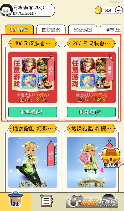 皮肤展示与兑换功能:展示《王者荣耀》《和平精英》等游戏的皮肤列表,每个皮肤标注所需金币数量、所属游戏及皮肤品质(如史诗、传说、限定);玩家积累足够金币后,可点击兑换按钮完成操作,兑换过程需绑定游戏账号,确保皮肤准确发放至对应账户,兑换记录可在“我的兑换”中查询。