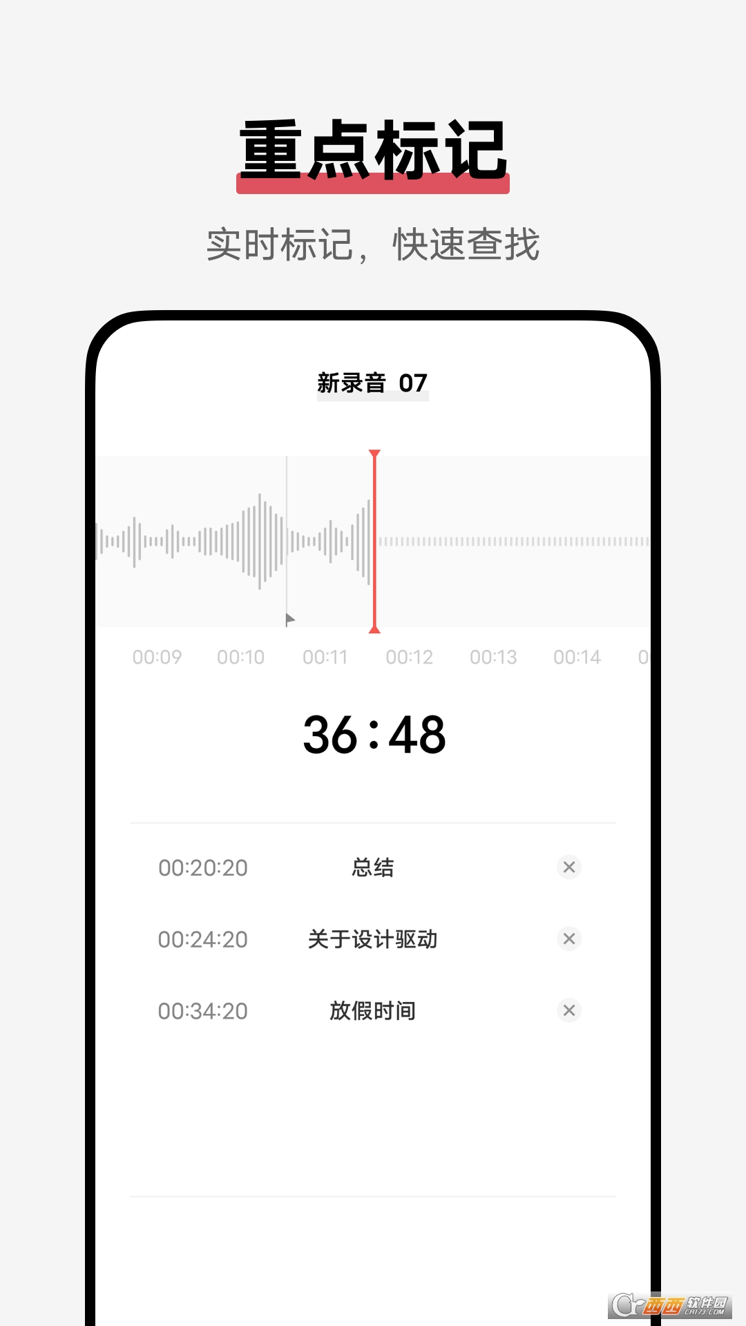 录音过程中可以打标记。回放时快速定位重点。适合记录会议要点。