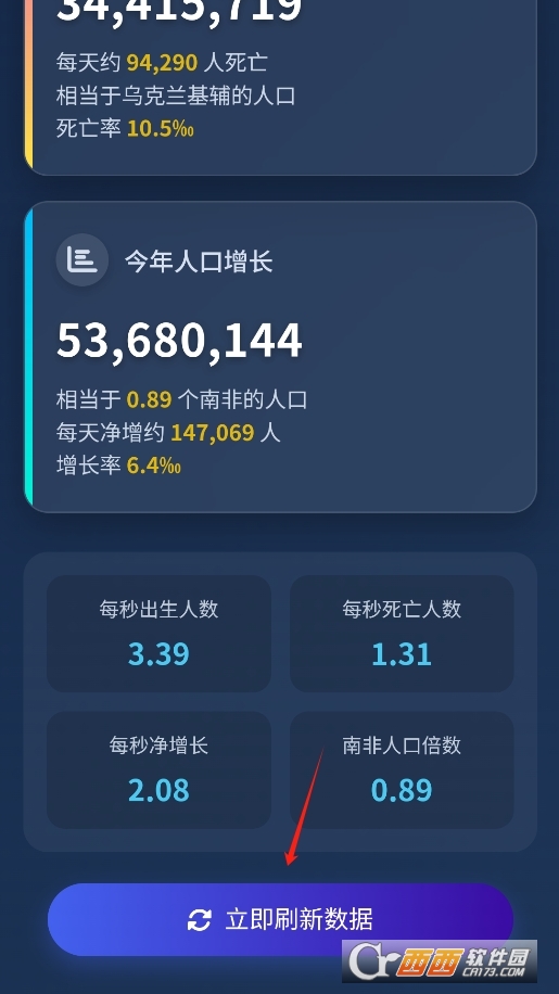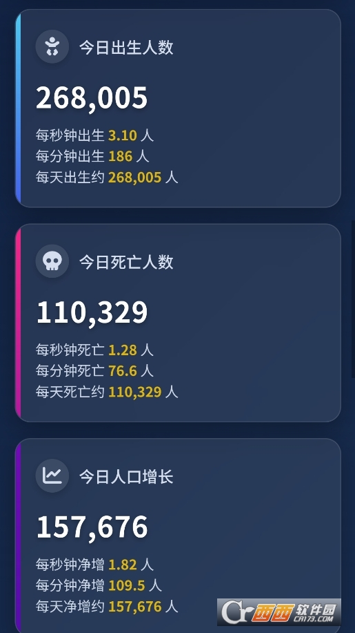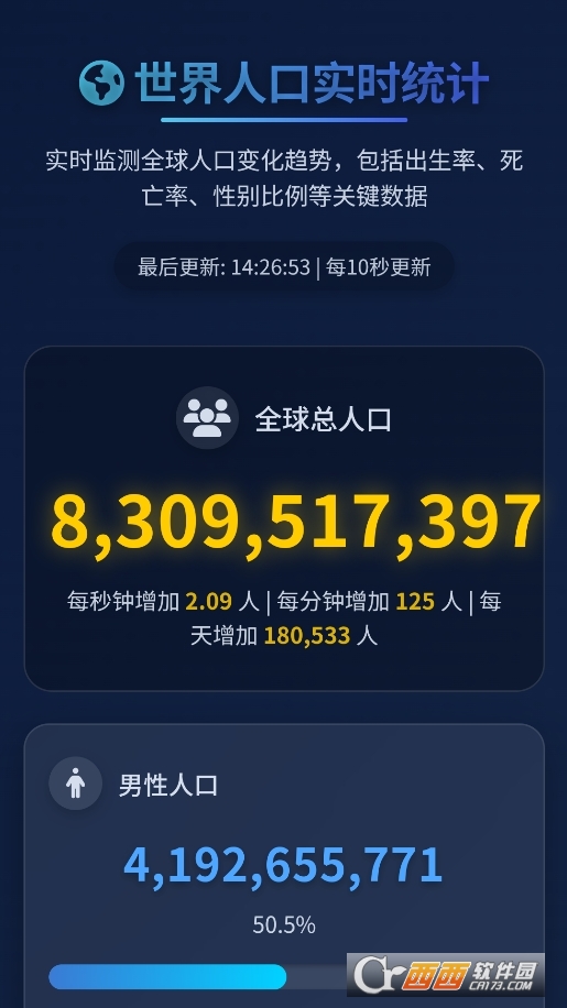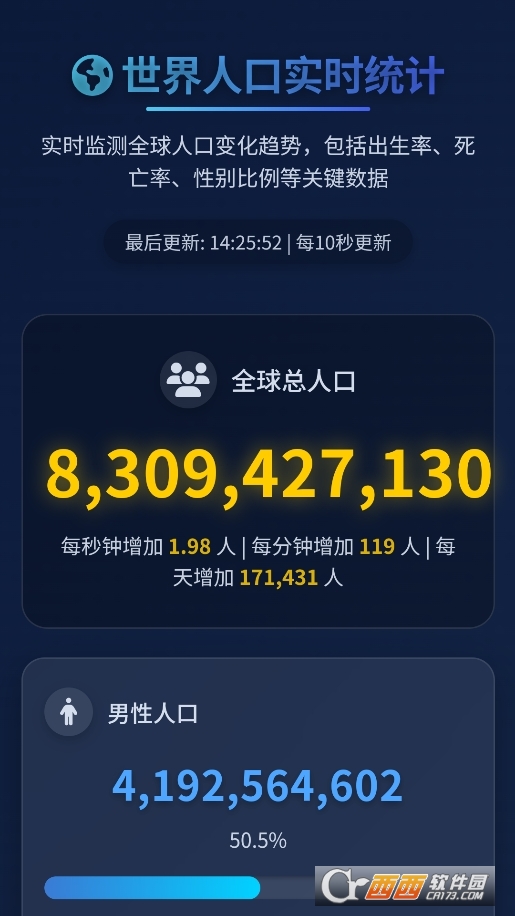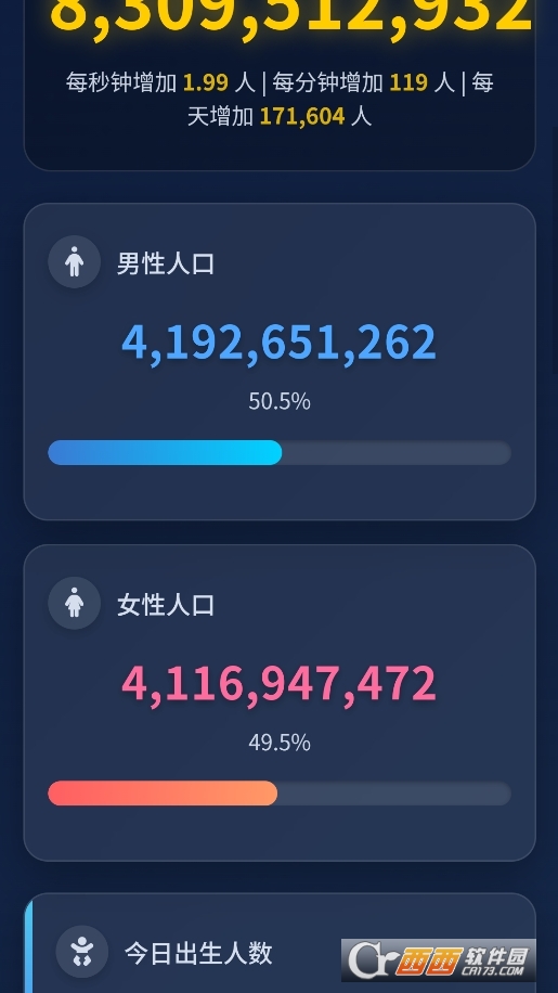 它能显示的内容很详细,包括男性人口数、女性人口数,还有今年新增的出生人数、累计死亡人数。比如想知道“今年全球出生了多少人”,点进去就能看到具体数字,不用再去翻各种统计报告,省事多了,喜欢的快来下载吧。