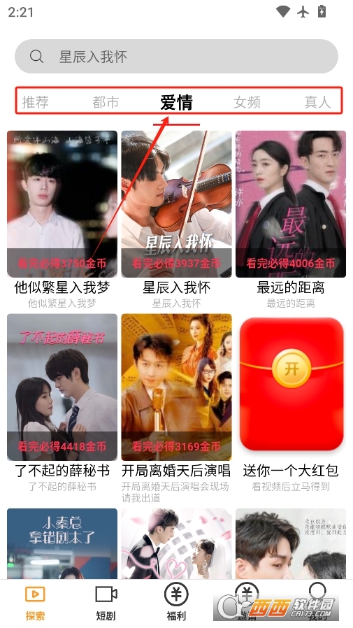 在最上方选择各种不同分区也可以找到不同类型的短剧观看