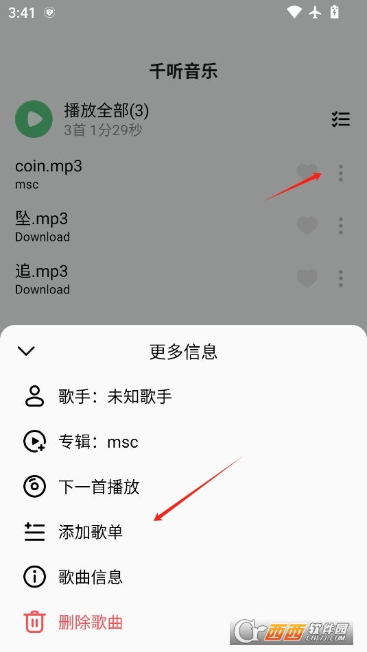 创建完成后回到主页找到喜欢的歌曲,点击右侧按钮,点击添加歌单