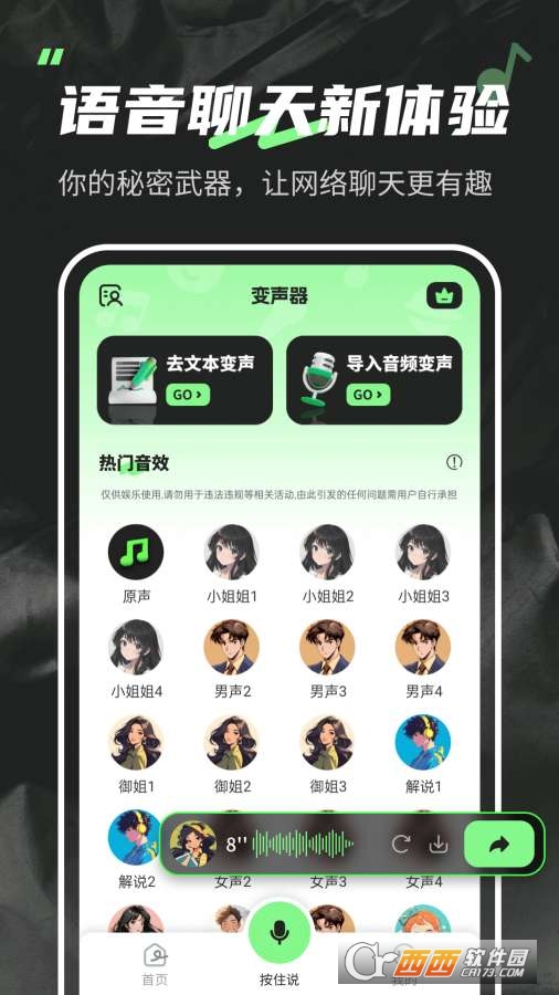 6、便捷分享:通过社交媒体如微信、QQ等渠道,与朋友分享有趣的变声音频,共同参与语音娱乐活动。