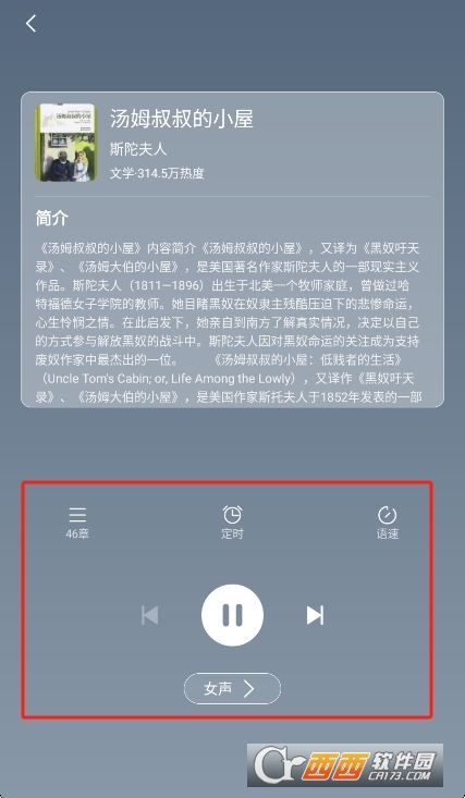 2、在线播放与控制功能:支持流畅的在线播放,音频加载速度快,播放过程稳定。用户可在播放界面轻松实现播放、暂停、快进、后退等操作,还能根据自己的需求调节播放速度,满足不同用户对听书节奏的偏好。此外,软件还设有定时关闭功能,用户可设置在一定时间后自动停止播放,方便在睡前听书时使用,无需担心耗电和内容持续播放的问题。