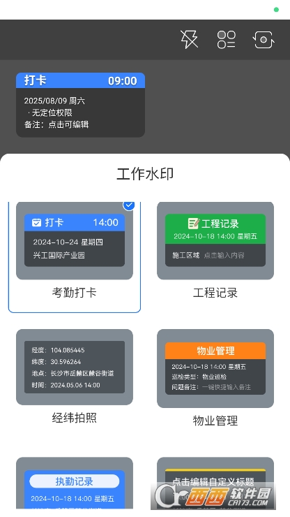 水印模板资源丰富且适用场景广泛,涵盖工作、生活、旅行等多种场景,满足不同用户的打卡需求。工作类有工程巡检、考勤签到等模板,生活类包含生日纪念、日常记录等,旅行类则有景点打卡、行程记录等,每种场景下又细分多个风格供选。