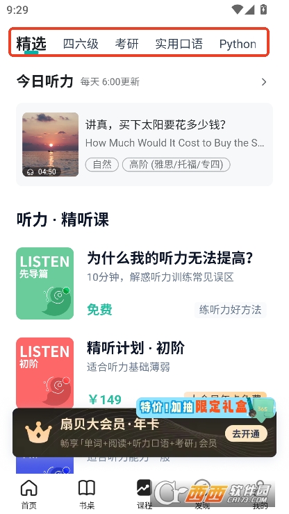 扇贝阅读app2025版官方下载是一款便捷实用的英语学习练习软件,内置海量英语词书短文,涵盖专栏,考试,小说,人物,科普,生活,文化,商业,通识等多种类型,还能根据用户的喜好生成智能个性化的学习计划,帮助用户养成良好的学习习惯。更多四六级,考研,实用口语等听力跟读课程,能够满足不同用户的学习需求。