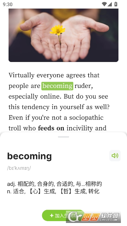 2,点击单词即可获取其读音,翻译以及加入生词本收藏