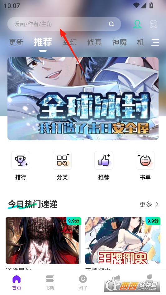进入软件之后点击最上方的搜索框输入关键词查找想看的漫画