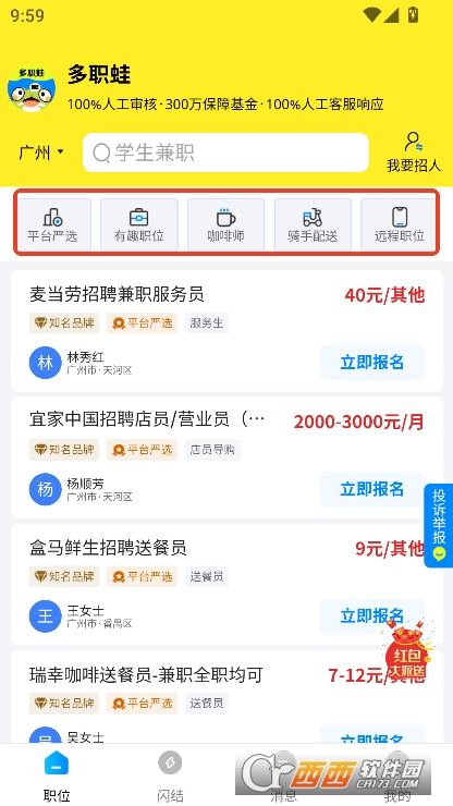 多职蛙app官方版免费下载是一款专业的线上兼职招聘求职平台,与全国各大用人单位展开深度合作,为用户提供海量的合适岗位信息。通过城市定位智能附近附近岗位,也能通过关键词快速搜索,平台提供详细的岗位内容介绍,包含工作日期,工作时段,地理位置,职位要求等,用户可以通过平台在线沟通与报名,助力高效求职。
