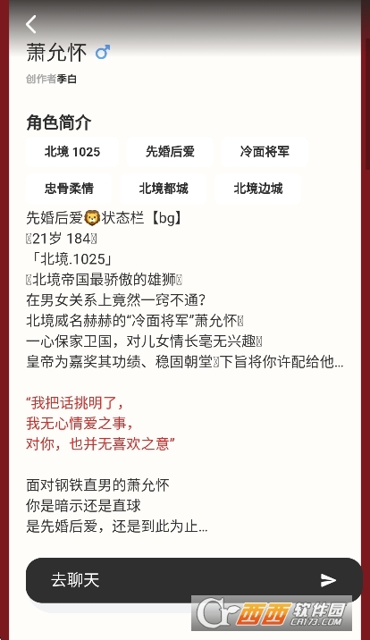 1、角色设定与认知功能:提供丰富的预设角色库,每个角色都有详细的人设介绍,包括姓名、年龄、身份、性格、背景故事等,帮助用户快速了解角色;支持角色筛选与收藏,用户可根据风格、题材等筛选心仪角色,并将常用角色加入收藏,方便随时开启互动;AI角色能主动发起符合自身人设的话题,引导用户进入剧情,降低互动门槛。
