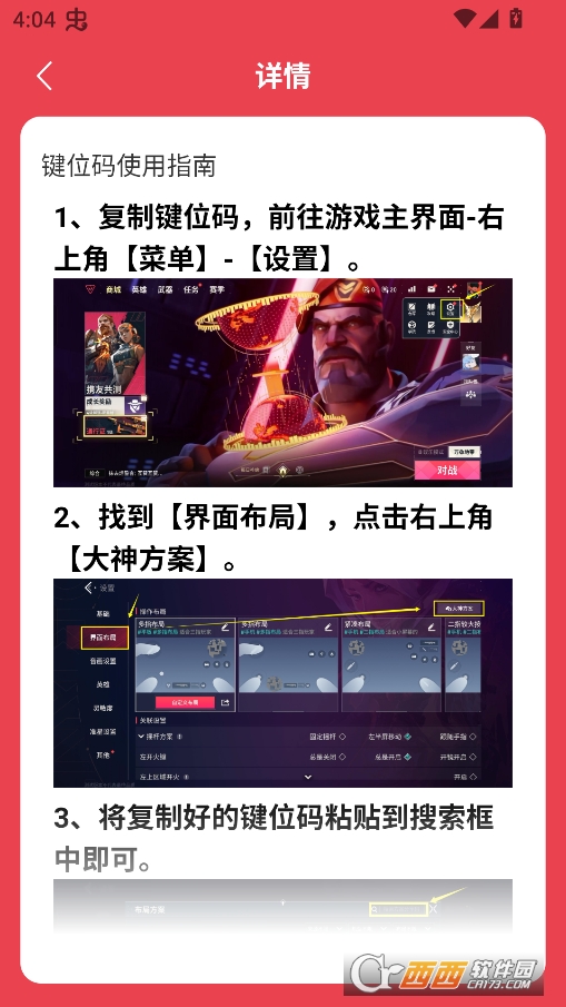 这是一款为无畏契约手游玩家打造的辅助工具,核心靠丰富的大神键位方案和便捷的复制功能吸引用户。适合所有想优化键位设置的游戏玩家。软件界面设计简单,分类清晰。按主播名字或玩法风格就能找到对应的键位方案,查找起来很方便。在西西就能下载安装,安装包不大。占用手机内存少,运行起来很流畅,不会影响游戏进程。