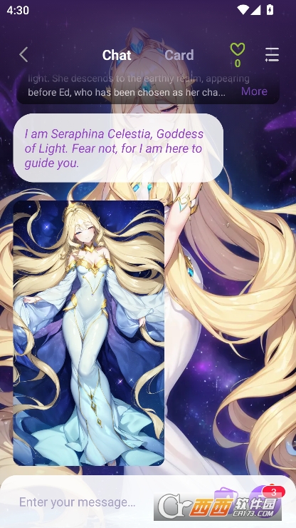 沉浸式聊天体验:聊天时会呈现对应场景画面,比如与海洋生物角色对话时显示海底场景,与宫廷角色聊天时展现宫殿景象,增强代入感。且支持中文对话,用户可直接输入内容与角色互动,对话过程中角色会根据剧情推进做出符合设定的回应,开启剧情式聊天。