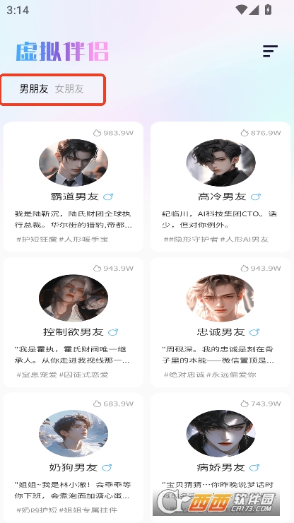 虚拟恋人AI伴侣app安卓版免费下载是一款AI虚拟角色在线实时互动的聊天软件,内置霸气男友,高冷男友,元气女友,御姐女友等多种AI角色模型,点击感兴趣的角色就能直接进入对话模式。AI角色会根据用户发出的文字,结合自己的人物设定与背景进行智能回复,带给用户沉浸式的聊天互动体验。
