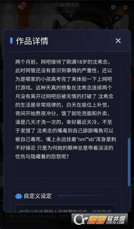 1、高度自由的角色定制:支持用户对虚拟角色进行深度身份设定,可自定义角色的职业(如学生、医生、艺术家)、性格(如活泼开朗、温柔体贴、高冷傲娇)、口头禅等细节,让角色完全贴合个人偏好,打造专属虚拟伙伴。