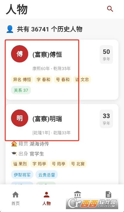 历史人物:详细记录了从皇帝将相到平民百姓的生平,共收录36,741位清代历史人物。