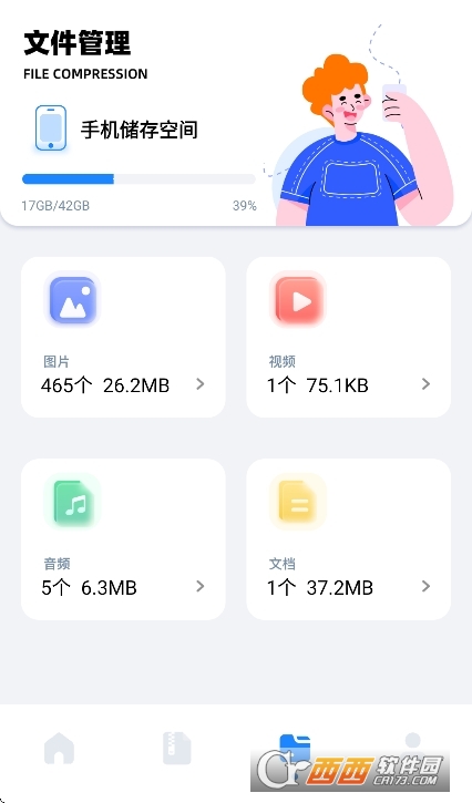 1、智能分类存储:工具启动后自动扫描手机内所有文件,按“视频”“文档”“照片”“音频”“安装包”“压缩包”分类存储,每个分类栏显示文件数量、总大小,点击即可查看对应文件;支持按文件大小、创建时间、名称排序,方便快速筛选;