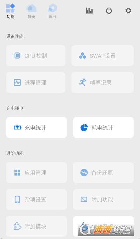 2、选好后就可以进入到app主界面了,点击“功能”,这里显示了帧率记录、充电统计、耗电统计等功能