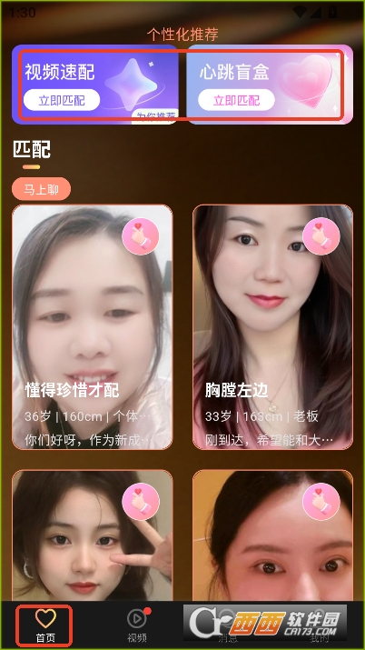 1,首页提供视频速配与盲盒匹配交友功能