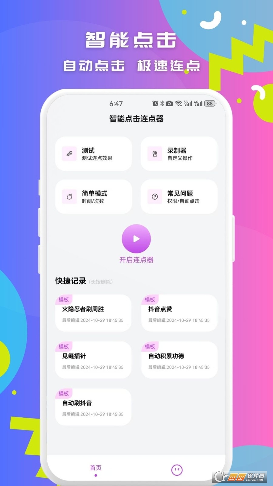 智能点击连点器安卓版是一款超实用的手机连点器,核心功能就是帮你自动点击屏幕,解放双手。不管是玩游戏时需要快速点击释放技能,还是刷任务时要重复点击某个按钮,它都能轻松搞定,不用再手动一直点屏幕,省得手指酸痛,真正解放你的双手。