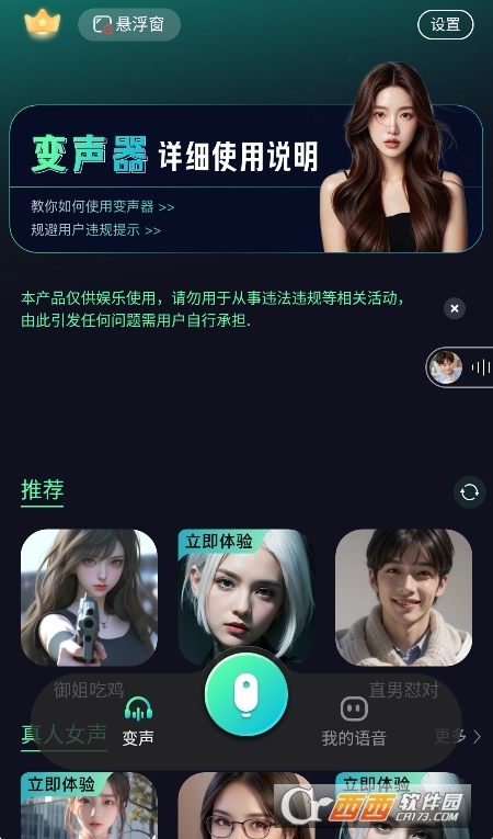 悬浮窗功能:通过开启悬浮窗,您可以方便地进行语音录制和变声操作。只需在首页开启悬浮窗,点击悬浮窗选择“语音变声”,录制音频并选择不同音效类型,听取变声效果,满意即可保存。