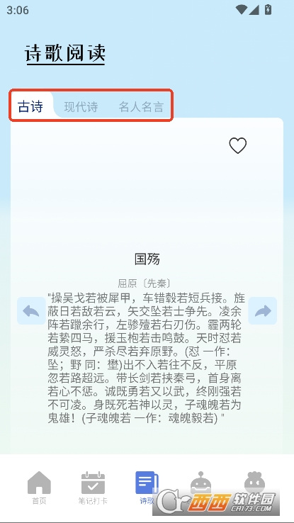 多功能整合:将小说阅读、诗歌欣赏、答题互动、打卡记录等功能融合,无需切换多 APP 即可满足多种需求。各功能数据互通,例如阅读时长可关联打卡记录,答题积分可兑换阅读主题,形成完整的使用闭环,提升用户粘性。