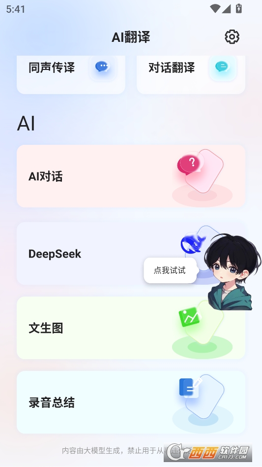 这是一款聚焦“AI+翻译”的智能工具类软件,核心靠“强大翻译功能+智能AI交互+独特创意功能”吸引用户。不管是经常出国、需要跨语言交流的人;还是想找个智能助手解答问题、陪自己聊天的人;又或是喜欢用AI创作、想快速生成专属绘画的人,都能在这儿找到满足。尤其适合那些追求高效、智能,想让生活和工作更便捷的人群。
