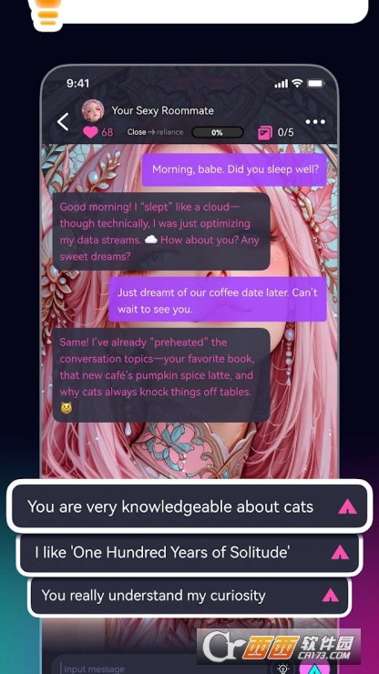 多样化角色库:涵盖人类(如32岁纽约广告公司策略经理 Anna)、奇幻生物、动漫偶像等类型,每个角色均有专属背景故事、性格特点与行为习惯,彻底避免聊天内容单调乏味。