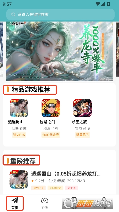 查找目标游戏:进入首页,可直接筛选精选游戏、热门游戏,也能通过搜索框输入游戏名称、类型等关键词精准查找;还能进入游戏板块,按照游戏分类(仙侠、卡牌、传奇等)、题材进一步筛选。