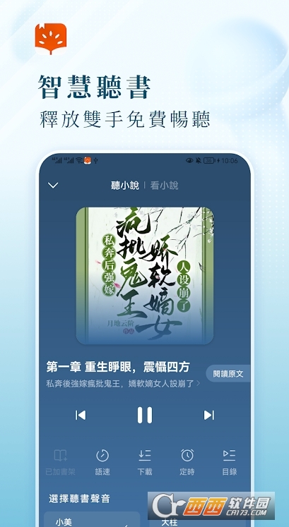 2、创新听书功能,阅读更灵活。内置智能听书功能,支持小说全文语音朗读:提供多种音色(温柔女声、沉稳男声、活泼童声),可调节朗读语速(0.82倍);支持“后台听书”,切换其他应用时仍能继续收听,适配开车、做家务等无法手动阅读的场景,让阅读突破场景限制。