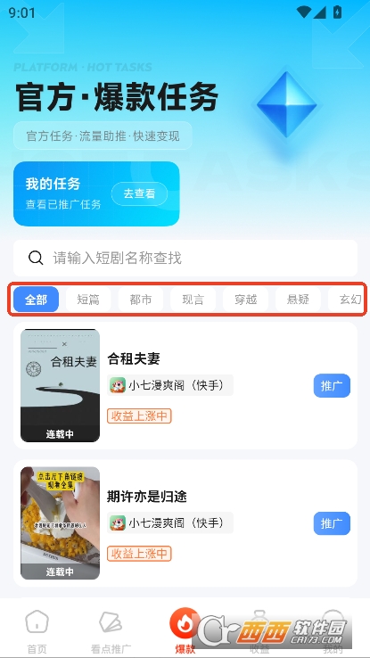 多平台智能分发与流量助推:支持将推广内容一键适配至快手“多来看点”、抖音“多来看点”、喵星点播等平台,且官方爆款任务(如小说、短剧推广)可获得流量倾斜,助力内容快速触达更多用户,提升变现效率。