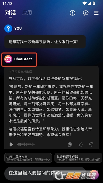 ChatGreat官方正式版下载是一款便捷实用的多功能AI综合服务助手,内置强化的智能对话引擎,能够通过文字的方式与用户进行对话问答,还能生成小红书文章,抖音标题,恋爱扮演,短视频剧本等功能。同时还内置了AI生活工作,学习休闲领域内的多种类功能,只需输入关键字即可快速获取对应内容,满足不同用户的多样化使用需求。