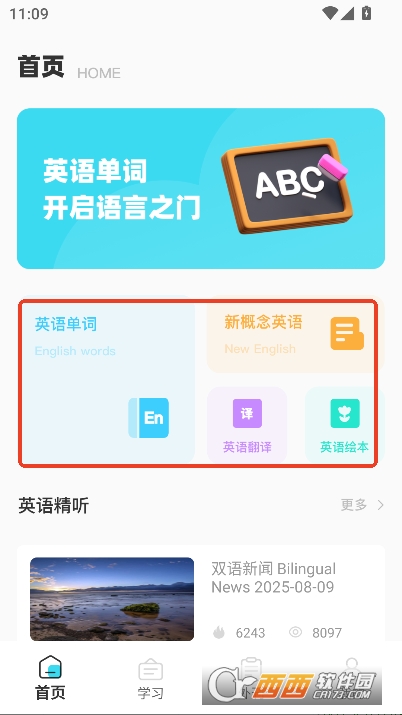1,首页提供丰富的英语单词库与翻译绘本内容