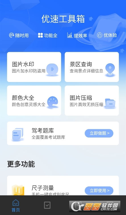 功能实用贴合需求,每个功能都针对日常高频场景设计,比如图片添加水印可保护版权,景区信息查询方便出行规划,尺子测量能应急测量尺寸,没有冗余功能,每一项工具都能切实解决用户问题,实用性远超杂而不精的工具箱。