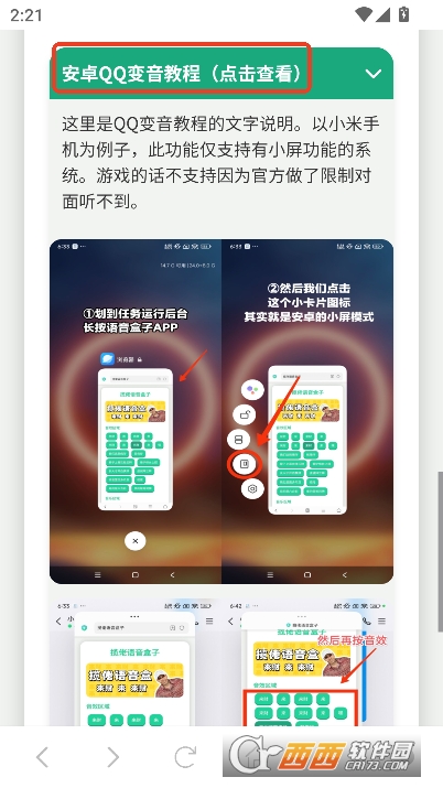 独立设置使用帮助板块,针对性提供安卓QQ变音教程、安卓微信变音教程、安卓苹果手机没声音解决方案,每个教程均标注点击查看,用户遇到问题时无需四处搜索,直接在软件内即可获取清晰指引,高效解决使用难题。