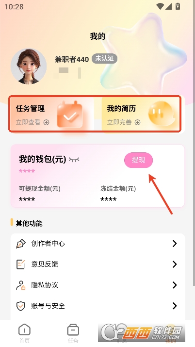 4,还能通过个人中心查看任务与在线简历,账户余额