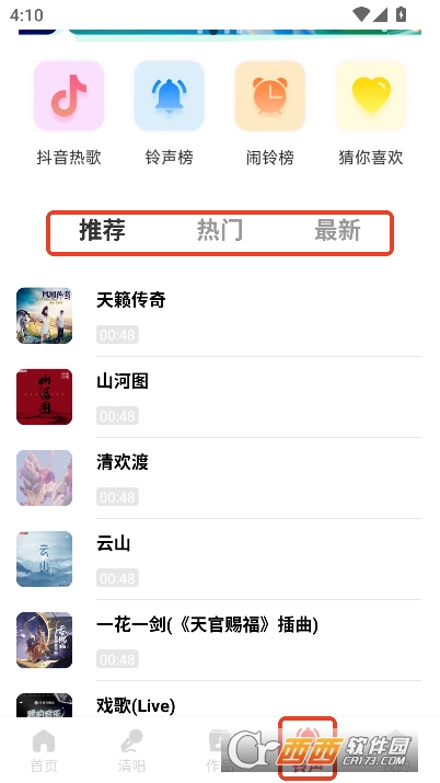 操作路径极简:界面仅设 首页、清唱、作品、铃声、我的5个核心板块,功能分类清晰,每个板块目标明确,新手无需摸索,就能快速找到唱歌、设置铃声等目标操作。