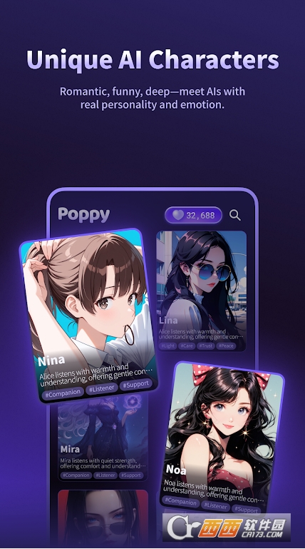 Poppy是一款专门做AI角色聊天互动的软件,最让人放心的就是它免费还没禁词、没敏感词,聊天的时候不用小心翼翼怕触发限制,想聊什么话题都能轻松展开,不管是日常唠嗑、分享心情,还是讨论兴趣爱好,都能和AI角色自然互动,没有沟通阻碍。