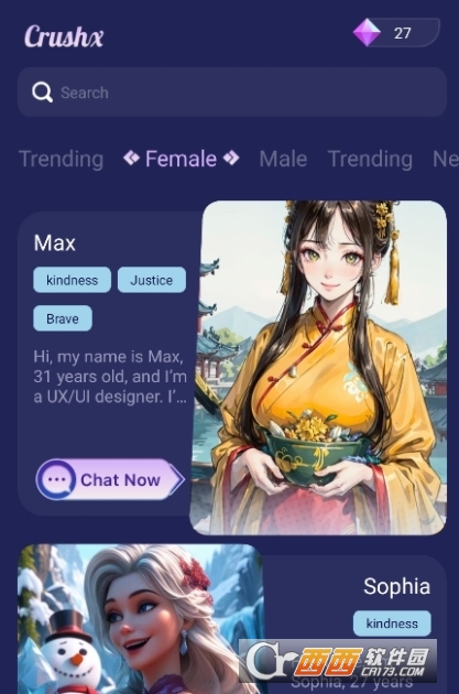 CrushX聊天软件中文最新版是一款优秀的ai女友对话软件,提供丰富的ai女友或者男友,提供多样化的二次元角色,获得超惊喜的ai对话体验,非常受欢迎,能够支持小伙伴们进行下载,提供优秀的操作体验,感兴趣的小伙伴们一定不要错过了。